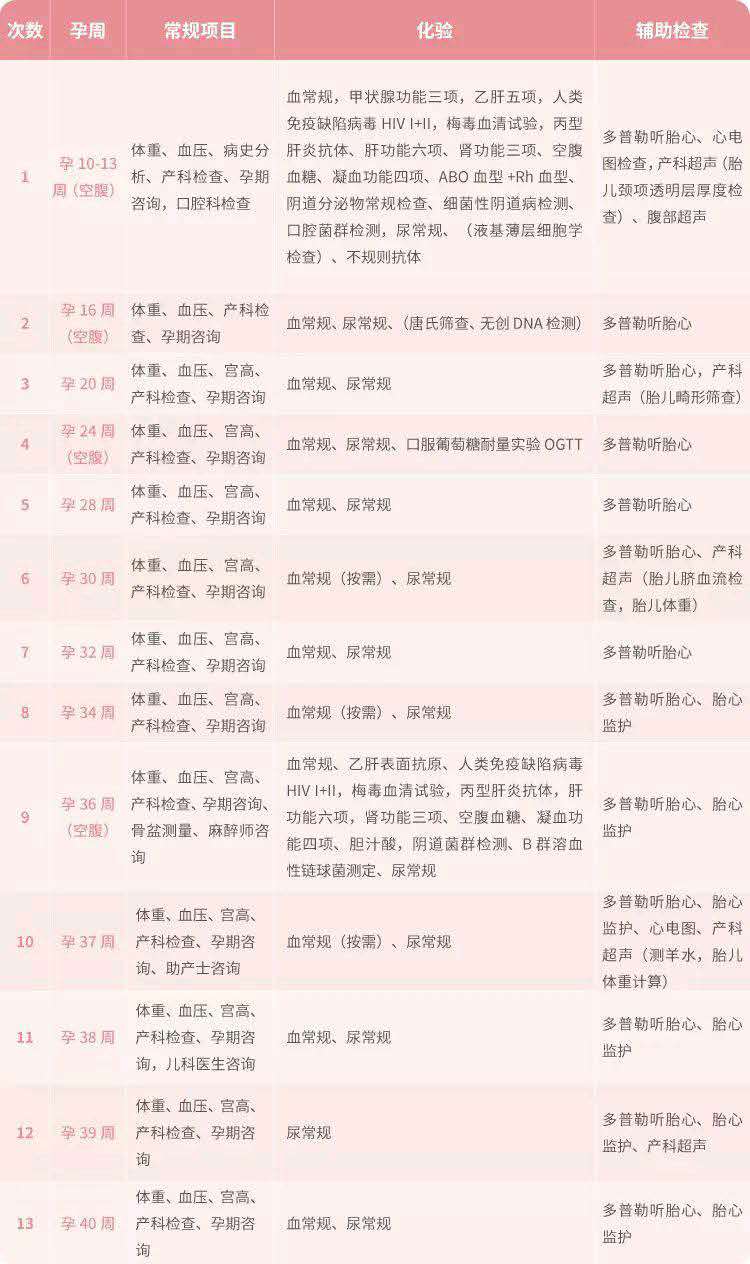 一般情況下,整個孕期準(zhǔn)媽媽大約需要進(jìn)行13次以上的產(chǎn)檢,每個時期關(guān)注的重點(diǎn)也是不一樣的。